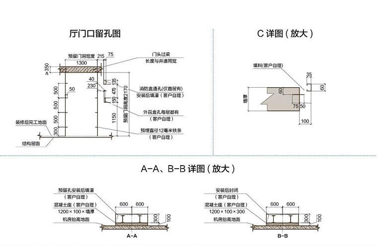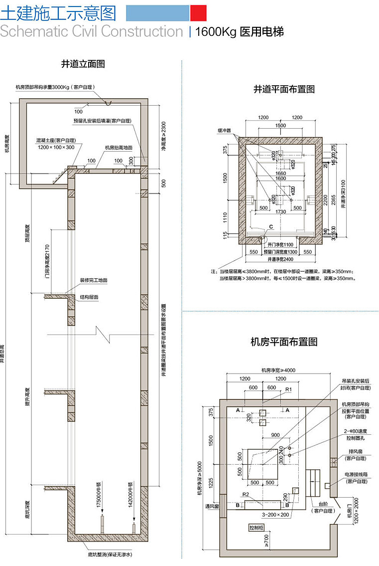 | 08 当相邻两层门地坎间的距离大于11m时,其间应设置井道安全门,安全门的尺寸不得小于350mm宽x1800高,此门不得向井道内开启。 09 底坑整浇,不得渗水。 10 根据技术参数表中的要求应设置供电梯使用的独立电源:该电源需设置带保护的开关且上锁,电压波动范围不得超过±7%,电源零线和接地线应分开,且接地电阻不得大于4Ω,并将此电源接到机房靠门侧。 11 图中所有载荷,除特别注明外都含冲击修正量,井道墙和底坑的强度必须能承受。 12 如不预留吊装孔,需付一定起吊费用。 13 井道无需牛腿。 14 若顶层高度不够,则需要抬高机房地面。 15 根据国家质检总局技术规范TSGT7001相关要求,机房必须专用,不得用于电梯以外的其他方面用途。 | |